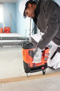 La bande plastique du clou se détache pour laisser le clou à fleur de l'élément fixé,
