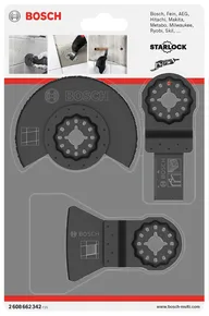 Set Starlock polyvalent pour travaux de rénovation et de transformation sur carrelage : déjointage de carreaux aux murs et au sol, enlèvement de mortier ou de colle à carrelage, réalisation de petites découpes dans les carreaux muraux tendres.